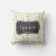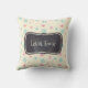 A pillow with a cold and wintery christmas pattern. A repeating pattern of pink and blue snowflakes set on a cream colored background. In the center is a watercolor frame which says Let it Snow. A seasonal holiday design.