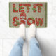 This rectangular coir doormat features the festive phrase "LET IT" stacked above "SNOW," both written in a textured red font that resembles knitted fabric and is adorned with green holly leaves and red berries. To the left, a charming cartoon snowman wearing a red knitted hat and scarf is depicted. The doormat is placed on a tiled floor in front of a wooden door, creating a warm and welcoming winter scene.