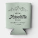 Give a wedding toast and a fun souvenir keepsake gift to your wedding guests with this personalized rustic sage green can cooler featuring a sketch of mountains, "Let The Adventure Begin" written in a mix of simple typography and a retro script, and your names and wedding date.