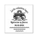 "Let the adventure begin" vintage script with paired with a car on the road illustration and all information your in a complementary font ready for easy customization. Check our store for more rubber stamp options.