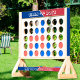 Add your own team names to this giant fast four game for your indoor or outdoor garden games for kids and adults. The design is lettered with "let the games begin" and you can change the team names on the front and back, such as Girls -v- Boys or Kids -v- Adults. It has a color palette of red white and blue.