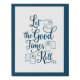 This wall canvas features a fun script font in navy blue that reads "Let the Good Times Roll." This cheeky saying is surrounded by rolls of toilet paper on a bright white background. There is a navy blue border that wraps around the edge of the canvas.