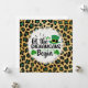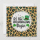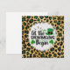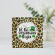 This holiday card captures the lively spirit of St. Patrick's Day with a mix of traditional and bold elements. The background is a leopard print pattern featuring black and green glitter spots on a golden-yellow base. At the center, a white circular area with a slightly faded edge creates a spotlight effect on the text and graphics within it. The playful and bold black text reads "let the SHENANIGANS Begin." Surrounding the text are charming St. Patrick's Day symbols: a green leprechaun hat with a black band and gold buckle, two green shamrocks, and a few smaller green clovers. The combination of the wild leopard print and the festive St. Patrick's Day icons makes this card vibrant, fun, and perfect for sharing the joy and mischief of the season.