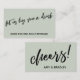 This suite's distinction is due to the modern, handwritten script font used for accent phrases. In this piece, the hand-lettered script font was used to create a graphic depicting the words "let us buy you a drink", placed on the front, and "cheers!" on the back. Use the template fields to add your personal details and make this unique, modern design your own. The sage green background can be changed to any color you prefer. Please reach out with any special requests or for customizing assistance. // 100 //