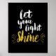 White Modern Brush Calligraphy style with words, “Let your light Shine” (based on Matthew 5:16), in gold style effect. The word “shine” has light ray illustrations extending on either side. Black background.