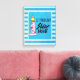 A canvas print with a blue striped pattern. A blue frame with a yellow border layered over top with a digital watercolor image of a red striped lighthouse inside.