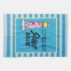 A kitchen towel with a blue striped pattern. A blue frame with a yellow border layered over top with a watercolor image of a red striped lighthouse inside. Typography text reads: Let your light shine bright.