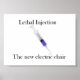 Decorate your cubicle, desktop, or other empty space with this 7" by 5" premium canvas poster by Blazing Sirens. It has the words "Lethal Injection" at the top, with a syringe directly below it. Underneath the syringe are the words "The new electric chair".