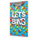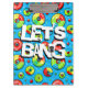 Green, blue and red let's bang, disc golf pun clipboard. Cool grunge distressed text with a disc gold background and a disc golf basket inside the text.