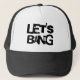 Green, blue and red let's bang, disc golf pun trucker cap. Cool grunge distressed text with a disc gold background and a disc golf basket inside the text.