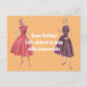 Funny retro themed design features two 1950s women on orange background with white "Happy Birthday. Let's celebrate by being wildly inappropriate" customizable text.