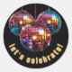Let's celebrate! sticker with three colorful disco balls on a black background.