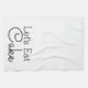 Modern white kitchen towel with the words "let's eat cake" in black lettering.
