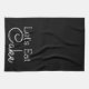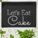 Modern black kitchen towel with the words "let's eat cake" in whitelettering.