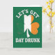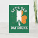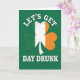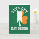 This card features a large shamrock centered on a solid emerald green background, and the three leaves are filled like the Irish flag with vertical green, white, and orange stripes. Above the clover, “LET’S GET” curves upward in thick white letters, and below it “DAY DRUNK” sits in matching white type, keeping the layout balanced from top to bottom. The flag colors and lettering have a worn, speckled texture that makes the design look like it’s been loved and laughed over for years. The big clover and punchy words feel like a cheeky toast between close friends, the kind shared with a grin and a gentle nudge at the bar. With the green backdrop wrapping everything together, the white text pops clearly while the orange stripe adds a warm accent that draws the eye. A little ☘️ and 💚 energy comes through in the simple color palette and the confident, centered composition. The distressed texture shows up as faint flecks and roughened edges across the shamrock and the white lettering.