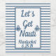 Perfectly preppy seersucker striped customizable "Let's Get Nauti" wine label in navy blue and white stripes with navy lettering for your nautical bachelorette party!