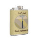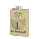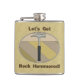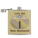 This cool geology hip flask features the phrase "Let's Get Rock Hammered!" with a logo featuring a cartoon drawing of a rock hammer on an angular unconformity background. The flask itself is brown, with a faint, brown repeating rock hammer pattern.