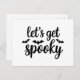 A dark gray background highlights the black text, "let's get spooky," adorned with small bat illustrations around the words. The playful and eerie design evokes a Halloween theme.