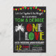 ONE LOVE WEDDING ANNIVERSARY JAMAICAN REGGAE THEMED PARTY INVITATION. Makes a fun and memorable wedding anniversary party invitation! The invite features Jamaican/Reggae themed graphics on a faux chalkboard background.