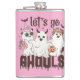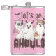 Cute and witty Halloween design on T-shirts, mugs, bags, pillows, buttons, and more features three funny Halloween ghouls with devil horns and witch hats, bats, flowers, jack o lantern pumpkin, and text that reads Let's Go Ghouls!