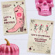 "Let's Go Ghouls" Halloween theme with illustration of three skeletons wearing pink and black cowboy boots and pink cowboy hats.