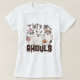 Cute and witty Halloween design on T-shirts, mugs, bags, pillows, buttons, and more features three funny Halloween ghouls with devil horns and witch hats, bats, flowers, jack o lantern pumpkin, and text that reads Let's Go Ghouls!