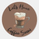 Delight your loved ones with the charming round sticker. Apply it to your invitation envelopes to convey the special request for having a coffee date soon. This watercolor latte, brimming with coffee and foam in a glass mug, features a delightful message, "let's have a coffee soon," adding visual appeal and setting the perfect tone for the occasion.