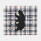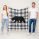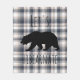 Cute "let's hibearnate" typography fleece blanket featuring a black bear silhouette over a rustic cream and gray plaid background.