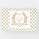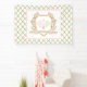 This pickleball banner has a watercolor image of a crest surrounded by branches with green and pink gingham pickleball paddles in the center. The design has a green trellis pattern with pink bows around the edge with the same pattern on the back. Colors used include moss green, blush pink and and tan. Text says "Let's Hit the Court."