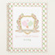 Plan a year's worth of Pickleball games with this preppy pickleball planner. This pickleball themed design has a watercolor image of a crest surrounded by branches with green and pink gingham pickleball paddles in the center. The front has a green trellis pattern with pink bows around the edge with the same pattern on the back. Colors used include moss green, blush pink and and tan. You can add a name and year.