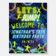 Let's Jump Birthday party with vivid neon glow lights and text in green, and blue, great for a trampoline park or bounce house birthday parties for boys and girls.