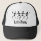 Halloween trucker hat shown in black and white with a cute dancing skeletons print. Buy as is or customize.