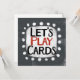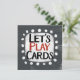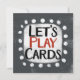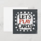 "Let's Play Cards" is a cute text design in gray with black and red text, along with a white accent shape and white textured whimsical dots surrounding it.