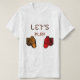 A dynamic design featuring "LET'S PLAY" in stylized, layered outlined text, positioned above two subtly shaded game controllers, one in orange and one in red.