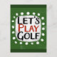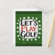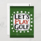 "Let's Play Golf" is a cute text design in green with black and red text, along with a white accent shape and white textured whimsical dots surrounding it.