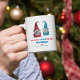 Brighten your holiday mornings with this cute personalized gnome christmas holiday mug featuring two adorable festive gnomes, a playful red heart, and your family name. The funny saying 'Let's stay gnome for the holidays' brings a warm, whimsical touch to any Christmas gathering. This charming mug makes a thoughtful gift or a special addition to your holiday drinkware collection. Sip your favorite beverage in style and gather your loved ones for cozy moments this season.