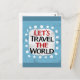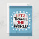 "Let's Travel The World" is a cute text design in blue with black and red text, along with a white accent shape and white textured whimsical dots surrounding it.