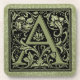 Charming decorative letter A initial monogram calligraphy style typography first letter in black over vintage avocado green book lining with off white Ginkgo biloba leaves.
