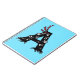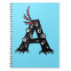 Letter A kids notebook with a cartoon illustration of a cute monster with body forming a capital letter A over customizable blue background. This funny character has many eyes and makes a funny expression showing its teeth. It even has tiny claws on its paws and three red feathers on its head which reveal its quirky personality.