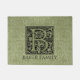 Charming decorative letter B initial monogram calligraphy style typography first letter in black over vintage sage green book lining with off white Ginkgo biloba leaves.
