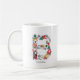 Whimsical, festive and elegant floral letter mug featuring flowers in foliage in red, green, gold and gray. Other colors and letters are available.