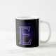 Mok with the letter E. (for example, your initial) Nice when your name starts with the E or another. Behind the letter is a grid and mysterious clouds with a light that shines on it. The letter E is filled with a flat pattern and a gray edge around it, colors blue, purple, yellow, and black.