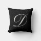 Personalized monogram pillow with a classic script letter D on a Black background. Made in the USA from machine washable cotton or polyester. Perfect for Danielle, Destiny, Diana, Desiree, Dominique, Daisy, Dana, Deanna, Diamond, Deja, Denise or anyone else who's name has an initial D.