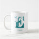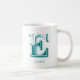 Customizable white coffee mug featuring the letter E in unique teal colored typography. Add your name using the personalization feature.