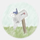 In the pastel drawing on this sticker, a blue bird has a letter to send. The plump little bird is holding an envelope with his beak, sitting on top of a gray mailbox that is mounted on a wooden post. The mailbox stands, tilted, in green grass against a pale blue sky. From my original digitally created image.