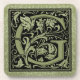 Charming decorative letter G initial monogram calligraphy style typography first letter in black over vintage sage green - avocado green book lining with off white Ginkgo biloba leaves.