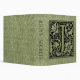 Charming decorative letter J initial monogram calligraphy style typography first letter in black over vintage sage green - avocado green book lining with off white Ginkgo biloba leaves.