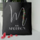 Watercolor red wildflowers initial M calligraphy monogram. Black tote bag with white letter and red flowers. Perfect for monogrammed gift.