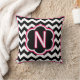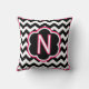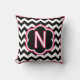 Letter N. Pretty monogram (single inital) throw pillow. Bold black and white zigzag (chevron) stripes, with white and fuchsia detailing and a single initial in the center.