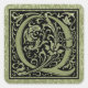 Charming decorative letter Q initial monogram calligraphy style typography first letter in black over vintage sage green - avocado green book lining with off-white Ginkgo biloba leaves.